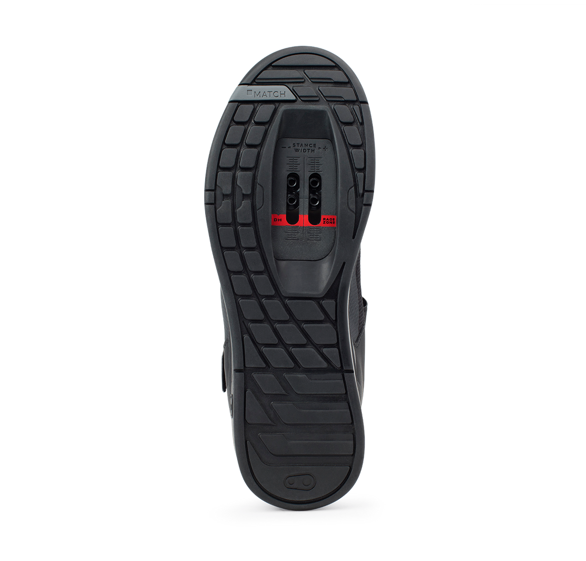 The ramped cleat box offers easy front and rear pedal entry and mud shedding. A Race Zone setback on the cleat track allows the cleat to be positioned further toward the heel for added control and stability when descending.