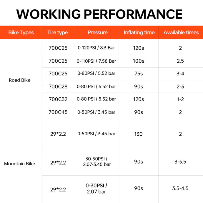 45-minute fast charging via Type-C port, ensuring quick power-ups. - Include adapters for Presta and Schrader valves, as well as ball needle and a hose extender for added versatility.