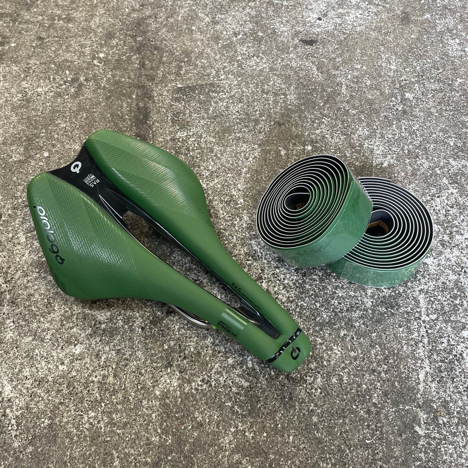 Upgrade your cockpit with this brand-new Prologo Dimension AGX Tirox saddle and matching green bar tape, removed from a new Cannondale build before use. Perfect for riders wanting premium comfort, fresh contact points, and a clean, coordinated look.