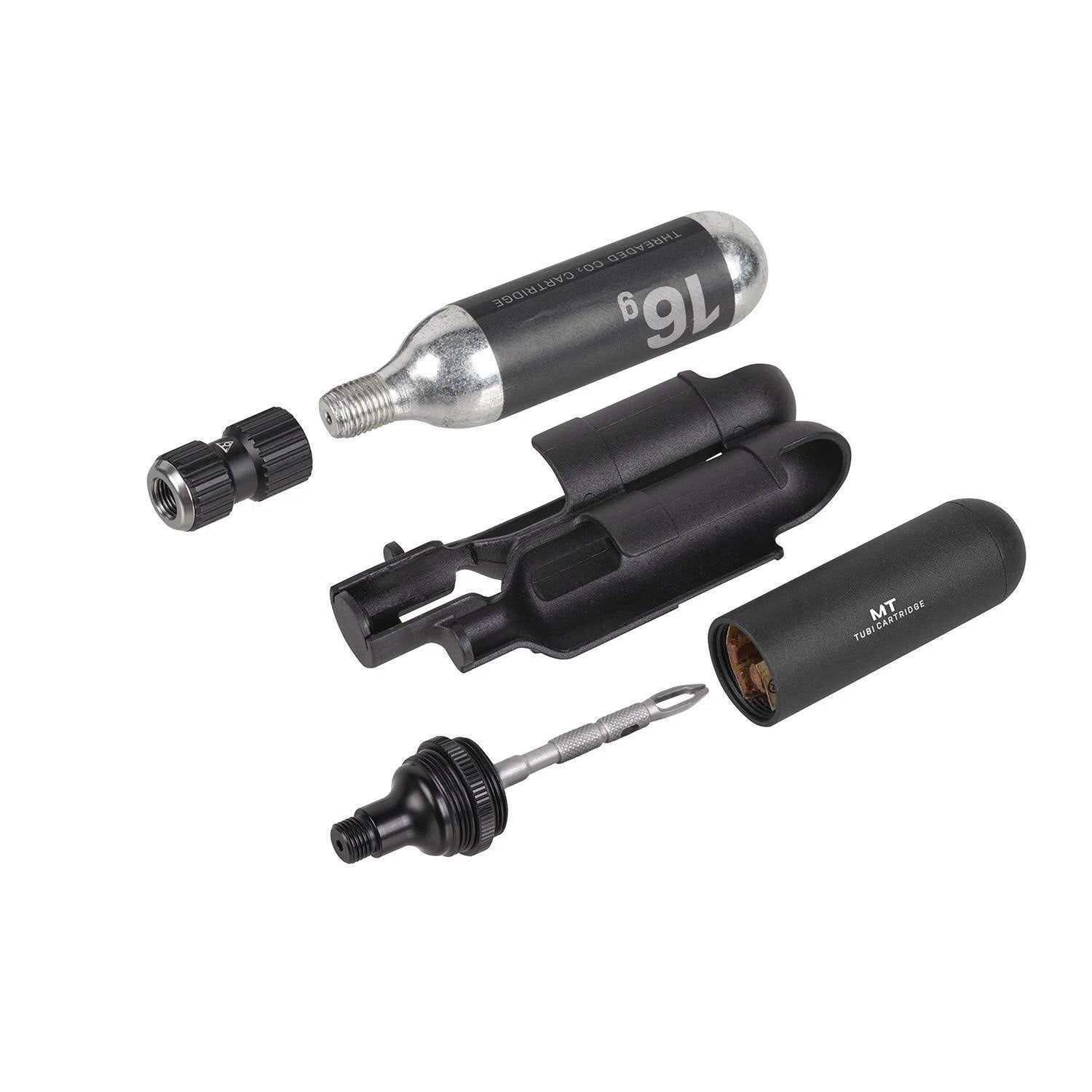 Ultra compact, race ready tubeless tire repair and CO2 inflation kit features a Nano AirBooster CO2 inflator, TubiCartridge G16, and 16g CO2 cartidge. Mounts to saddle rail with included Duo Fixer which provides dual use with Topeak Duo Fixer system accessories, including Topeak QuickClick saddle bags, CO2 inflators, lights, and fenders. A simple slide and click is all it takes to go on a safe and secure ride.